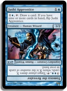 [2][U], [Tap]: Draw a card. If you have nine or more cards in hand, flip Jushi Apprentice.