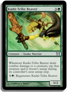Whenever Kashi-tribe Reaver deals combat damage to a creature, tap that creature and it doesn't untap during next untap step.