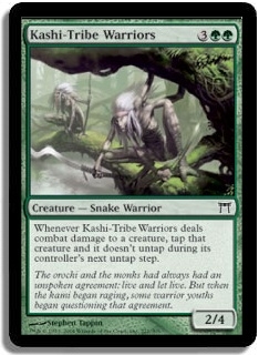 Whenever Kashi-Tribe Warriors deals combat damage to a creature, tap that creature. It doesn't untap during its controller's next untap step.