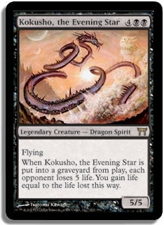 When Kokusho, the Evening Star is put into a graveyard from play, each opponent loses 5 life. You gain life equal to the life lost this way.