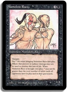 Trample. Pay * life when bringing Nameless Race into play. Effects that prevent or redirect damage may not be used to counter this loss of life. When Nameless Race is brought into play, * may not be greater than the total number of white cards all opponents have in play and in their graveyards.
