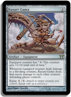 Whenever equipped creature deals damage to a blocking creature, Kusari-Gama deals that much damage to each other creature defending player controls.