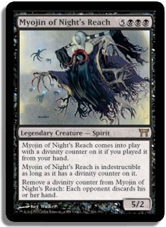 Myojin of Night's Reach comes into play with a divinity counter if you played it from your hand.