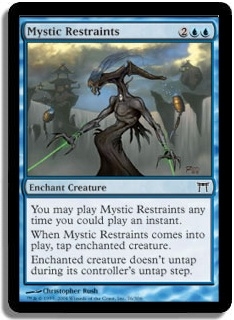 When Mystic Restraints comes into play, tap enchanted creature. Enchanted creature does not untap during its controller's untap step.