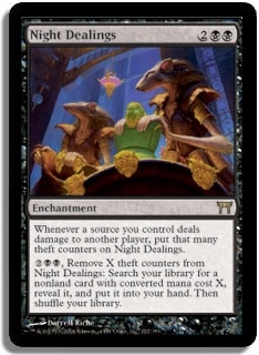[2][B][B], Remove X theft counters from Night Dealings: Search your library for a nonland card with converted mana cost X, reveal it, and put it into your hand. Then shuffle your library.
