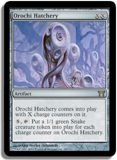 [5],[Tap]: Put a 1/1 green snake creature token into play for each charge counter on Orochi Hatchery.