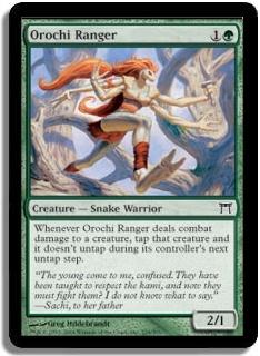 Whenever Orochi Ranger deals combat damage to a creature, tap that creature and it doesn't untap during it's contollers next untap step.
