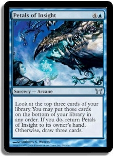 Look at the top 3 cards of your library. You may put those cards on the bottom of your library in any order. If you do, return Petals of Insight to owners hand. Otherwise, draw 3 cards.