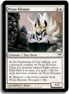 At the beginning of your upkeep put a devotion counter on Pious Kitsune. Then, if Eight-and-a-half-tails is in play, gain 1 life for each devotion counter on Pious Kitsune.