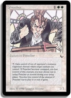 <T>: Gain control of one of opponent's creatures. Opponent chooses which target creature you control. If Preacher becomes untapped, you lose control of this creature; you may choose not to untap Preacher as normal during your untap phase. You also lose control of the creature if Preacher leaves play or at end of game.