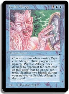 Choose a color when casting Psychic Allergy. During opponent's upkeep, Psychic Allergy does 1 damage to opponent for each card of this color that he or she controls. Sacrifice two islands during your upkeep or Psychic Allergy is destroyed.