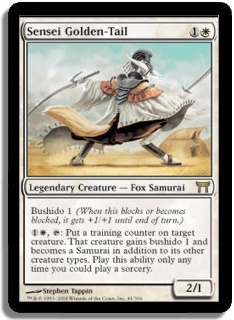 [1][W], [Tap]: Put a training counter on target creature. That creature gains Bushido 1 and becomes a samurai in addition to its other creature types. Play this hability only any time you could play a sorcery.