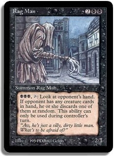 <BBB,T>: Look at target opponent's hand. If that player has any creature cards in hand, he or she discards one of them at random. Use this ability only during your turn.