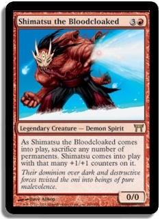 As Shimatsu the Bloodcloaked comes into play, sacrifice any number of permanents. Shimatsu the Bloodcloaked comes into play with that many +1/+1 counters on it.