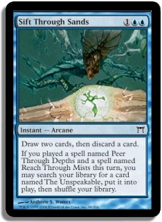Draw two cards, then discard a card. If you played a card named Peer Through Depths and a card named Reach Through Mists this turn, you may search your library for a card named The Unspeakable, put it into play, and then shuffle your library.