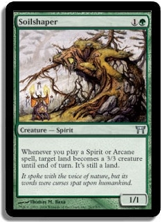 Whenever you play a Spirit or Arcane spell, target land becomes a 3/3 creature until end of turn. It's still a land.