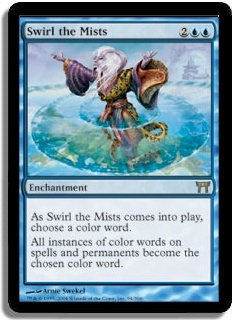 As Swirl the Mists comes into play, choose a color word. All instances of color words on spells and permanents become the chosen color word.