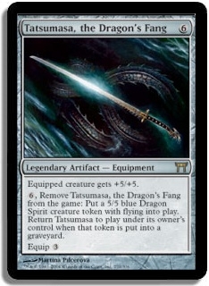 [6], Remove Tatsumasa the Dragon Fang from the game: Put a 5/5 blue dragon spirit token with flying into play. Return Tatsumasa the Dragon Fang to play under its owner's countrol when that token is put into a graveyard.