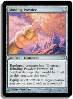 Equipped Creature has "Unattach Blinding Powder: Prevent all combat damage that would be dealt to this creature this turn."