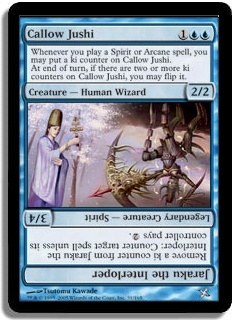 Whenever you play a Spirit or Arcane spell, you may put a ki counter on Callow Jushi . At end of turn, if there are two or more ki counters on Callow Jushi , you may flip it.