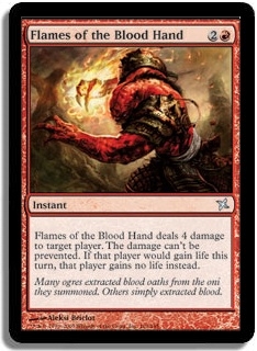 Flames of the Blood Hand deals 4 damage to target player. The damage can't be prevented. If that player would gain life this turn, that player gains no life instead.