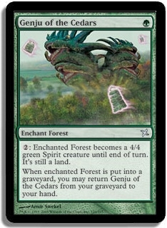 Whenever enchanted Forest is put into a graveyard, you may return Genju of the Cedars from your graveyard to your hand.