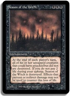 At the end of each player's turn, all of his or her untapped creatures that could have attacked but did not are destroyed. If you do not pay 2 life during your upkeep, Season of the Witch is destroyed. Effects that prevent or redirect damage may not be used to counter this loss of life.