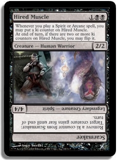 Whenever you play a Spirit or Arcane spell, you may put a ki counter on Hired Muscle. At end of turn, if there are two or more ki counters on Hired Muscle, you may flip it.