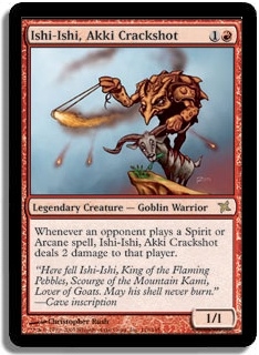 Whenever an opponent plays a Spirit or Arcane spell, Ishi-Ishi, Akki Crackshot deals 2 damage to target player.