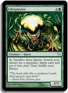 Tap, sacrifice 3 Spirits: Search your library for a legendary Spirit card and put that card into play. Shuffle your library afterwards.