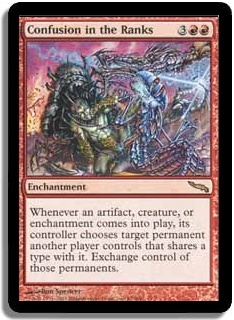 Order Confusion in the Rank's trigger to go on top of Natural Emergences trigger. Trade NE with an opponent's enchantment, and then activate Pyrohemia twice to destroy your opponent's lands. Allow Natural Emergences trigger to resolve, returning Confusion in The Ranks to your hand.
