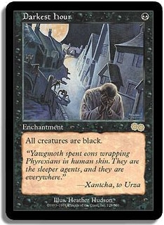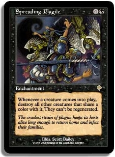 First, have the enchantments Darkest Hour and Spreading Plague out. Now, all creatures are black, and any time a creature is put into play, all other creatures (besides itself) are destroyed.