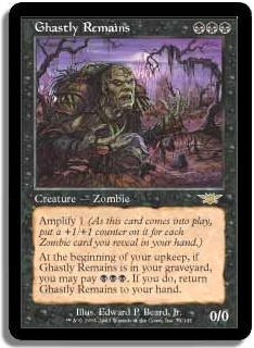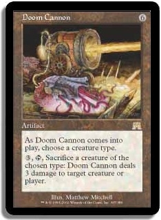 When Doom Cannon comes into play, choose Zombie. Bring Ghastly Remains into play, and reveal any zombie card from your hand, to give Ghastly Remains at least a 1/1. Sacrifice Ghastly Remains to Doom Cannon.