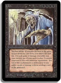 Lich is an interesting card, but dangerous to use. All it takes to kill you is to destroy the Lich enchantment.
