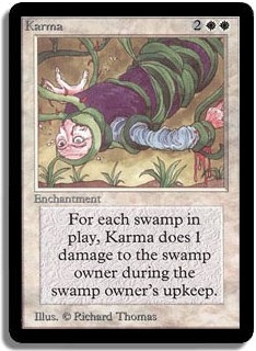 Karma damages players who have swamps in play. Using Magical Hack, you can change "Swamp" to Mountains, Forests, etc.