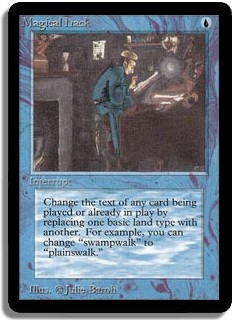 Change the text of target permanent or spell by replacing all instances of one basic land type with another. (It retains this ability until it leaves play.) (For example, you may change "swampwalk" to "plainswalk.")