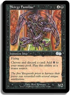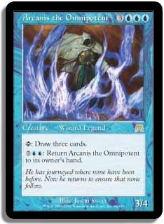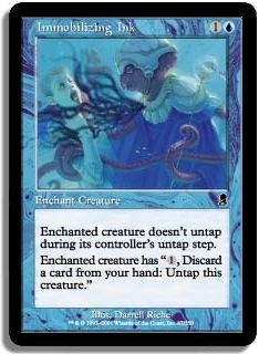 Pretty basic infinite draw combo. Enchant Arcanis with Immobilizing Ink, tap to draw three, discard a card to add one black with Skirge Familiar and then use the mana to untap Arcanis with Immobilizing Ink/discard another card